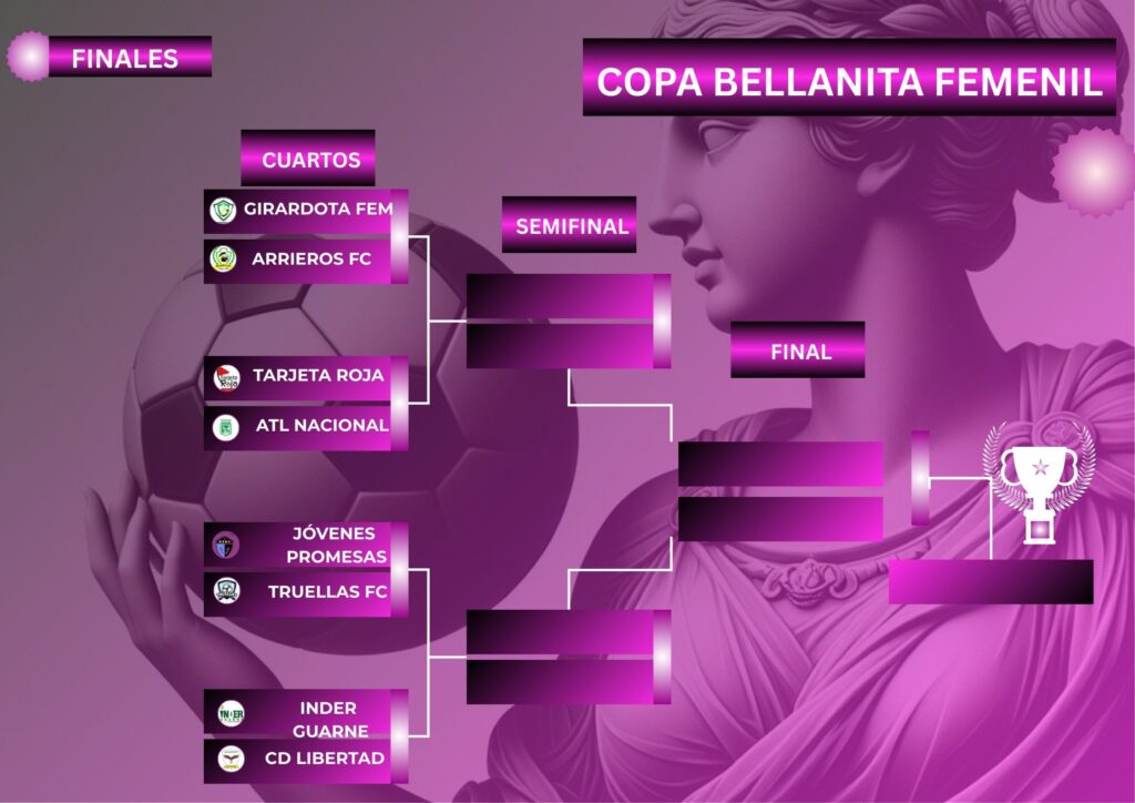 Cuartos de Final FINALES 7 Sep 2025 - 8:00 am GIRARDOTA FEMENINO FC 9 0 CORPORACION DEPORTIVA ARRIEROS FINALES 14 Sep 2025 - 5:00 am ATL NACIONAL ESC 0 6 TARJETA ROJA FINALES 14 Sep 2025 - 2:00 pm TRUELLAS FC 0 3 JOVENES PROMESAS FINALES 14 Sep 2025 - 3:30 am CD LA LIBERTAD 1 1 INDER GUARNE Semifinal FINALES 28 Sep 2025 GIRARDOTA FEMENINO FC - - TARJETA ROJA FINALES 28 Sep 2025 CD LA LIBERTAD - - JOVENES PROMESAS Final